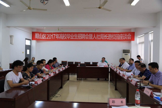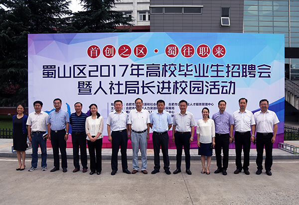 6月14日,“首創之區 蜀往職來”蜀山區2017年高校畢業生招聘會暨人社局長進校園活動在安徽新華學院隆重舉行。安徽省大中專畢業生就業指導中心副主任袁江林,合肥市委組織部副部長、市人社局局長、市公務員局局長吳松保,市人社局副局長何冰,市公共就業人才服務管理中心主任方強,蜀山區委副書記、區長葛斌,區委常委、常務副區長陳成朝等一行來到安徽新華學院,學院校長石秀和,副校長王麗,學生處、保衛處負責同志參加活動。